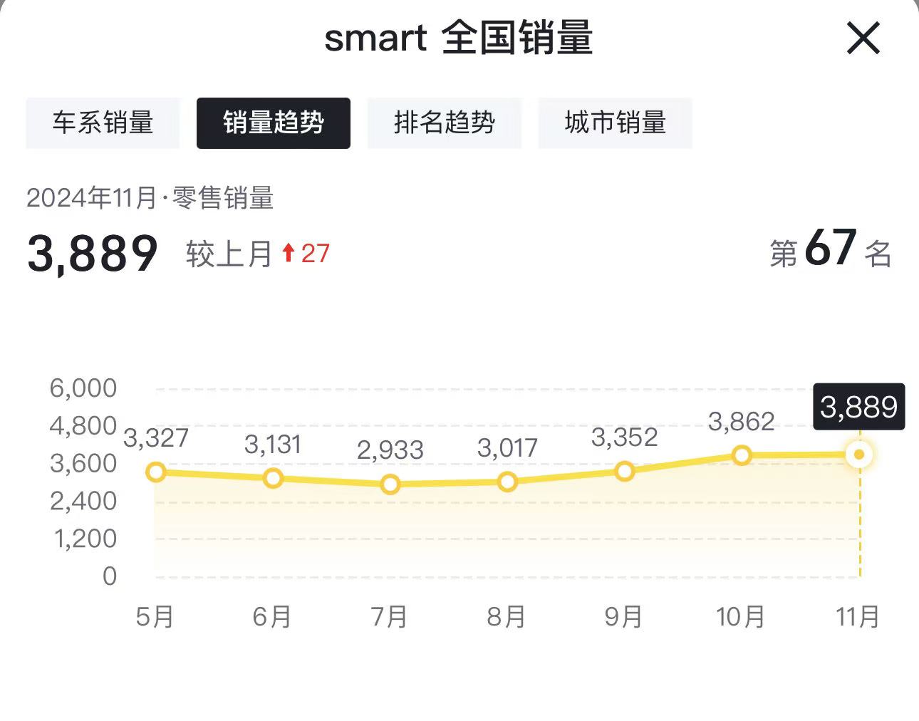 根据最新的销量数据显示,在11月份smart整体销量仅为3889辆,甚至不及当前热门车型单月销量的零头。