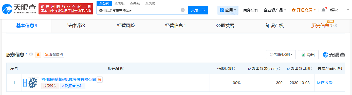 天眼查App显示,近日,杭州德渊贸易有限公司成立,法定代表人为吴洪宝,注册资本300万,经营范围包括国内贸易代理、货物进出口、技术进出口、办公用品销售等,由联德股份(605060)全资持股。
