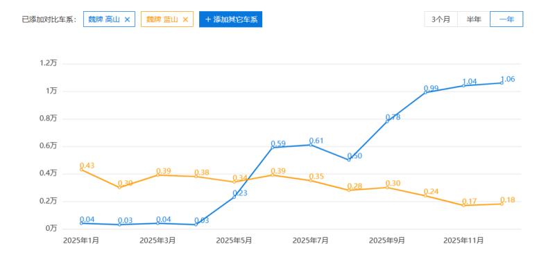 不过,在魏牌的高光背后,细究之下实际上已经暗藏隐忧。其中,作为魏牌的两大销量核心高山、蓝山在2025年交出了截然不同的走势。高山在去年5月推出新款之后,销量一路上涨,到去年底已经实现连续过万,且取得单月MPV市场冠军。全年销量达到5.9万辆,是魏牌在2025年实现规模化增长的关键。