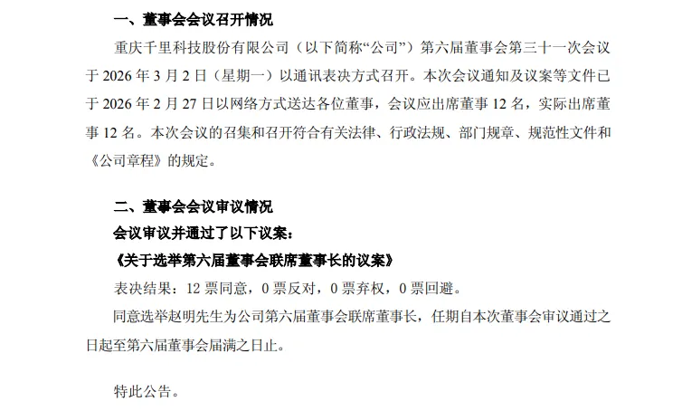 3月3日,千里科技发布公告称,公司董事会选举赵明为公司第六届董事会联席董事长,任期自本次董事会审议通过之日起至第六届董事会届满之日止。