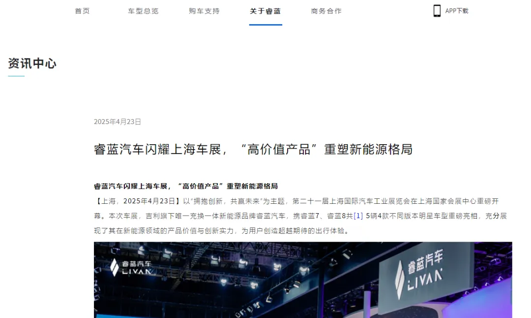 值得注意的是,睿蓝汽车官方网站上,最后一篇新闻发布的时间还是2025年4月23日,内容为《睿蓝汽车闪耀上海车展,“高价值产品”重塑新能源格局》。