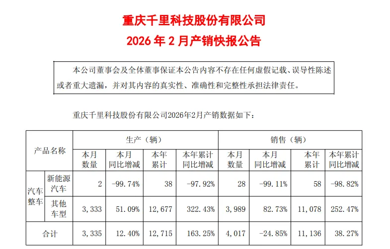 2025年12月,千里科技新能源汽车销量还有3835辆,全年甚至卖出了3.36万辆。可进入2026年,变天了。