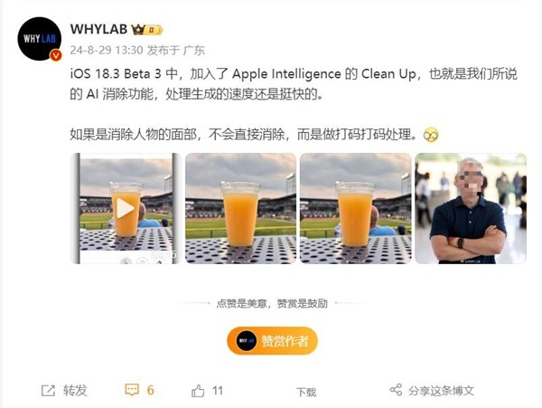 不过,这一功能并不是所有设备都能享用。实测发现,Apple Intelligence支持的设备仅包括iPhone 15 Pro、iPhone 15 Pro Max,以及搭载M1或更新芯片的iPad和Mac设备。这意味着,只有部分用户能够率先体验到这一先进的AI消除功能。