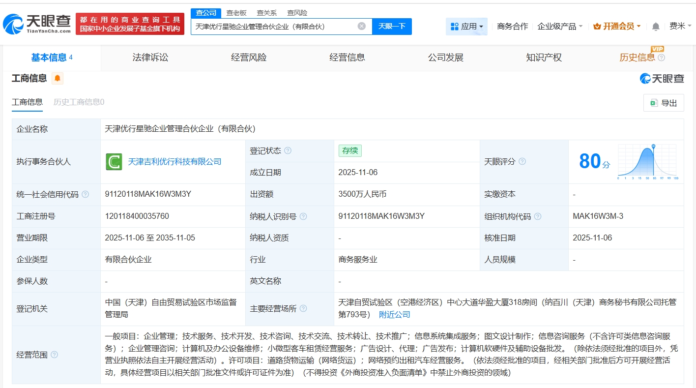 近日,天津优行星驰企业管理合伙企业(有限合伙)成立,执行事务合伙人为天津吉利优行科技有限公司,出资额3500万人民币,经营范围包括企业管理、信息系统集成服务、小微型客车租赁经营服务等。