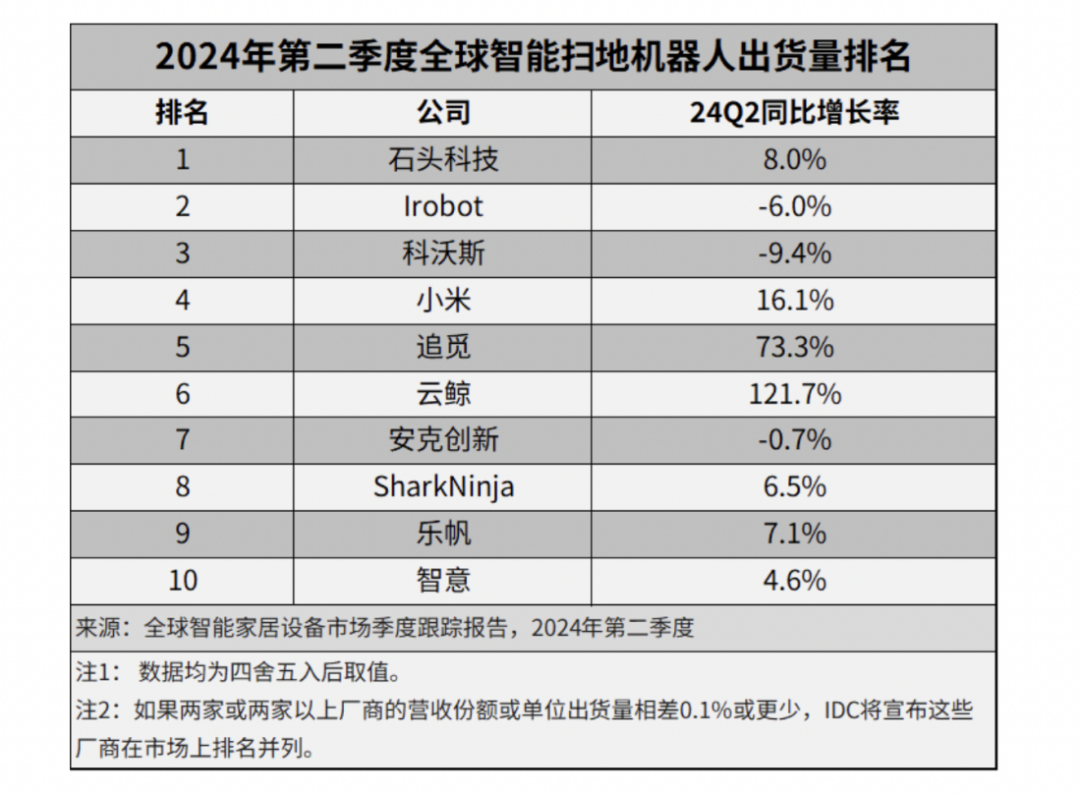 据IDC最新报告,2024年二季度,全球智能扫地机器人出货511.7万台,同比增长15.7%。在出货量前十位的企业中,中国公司或中资控股公司占了9家。其中,石头科技的扫地机器人出货量和金额均为全球第一;美国公司Irobot出货量同比下滑6%,排名第二;科沃斯的出货量也有下滑,同比减少9.4%至第三位。第四至第十名的公司依次是小米、追觅、云鲸、安克创新、SharkNinja、乐帆和智意。