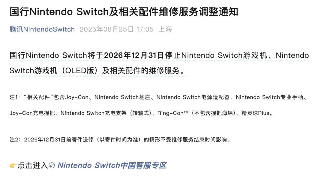【TechWeb】8月26日消息,据腾讯Nintendo Switch官方公众号消息,国行Nintendo Switch将于2026年12月31日停止Nintendo Switch游戏机、Nintendo Switch游戏机(OLED版)及相关配件的维修服务。