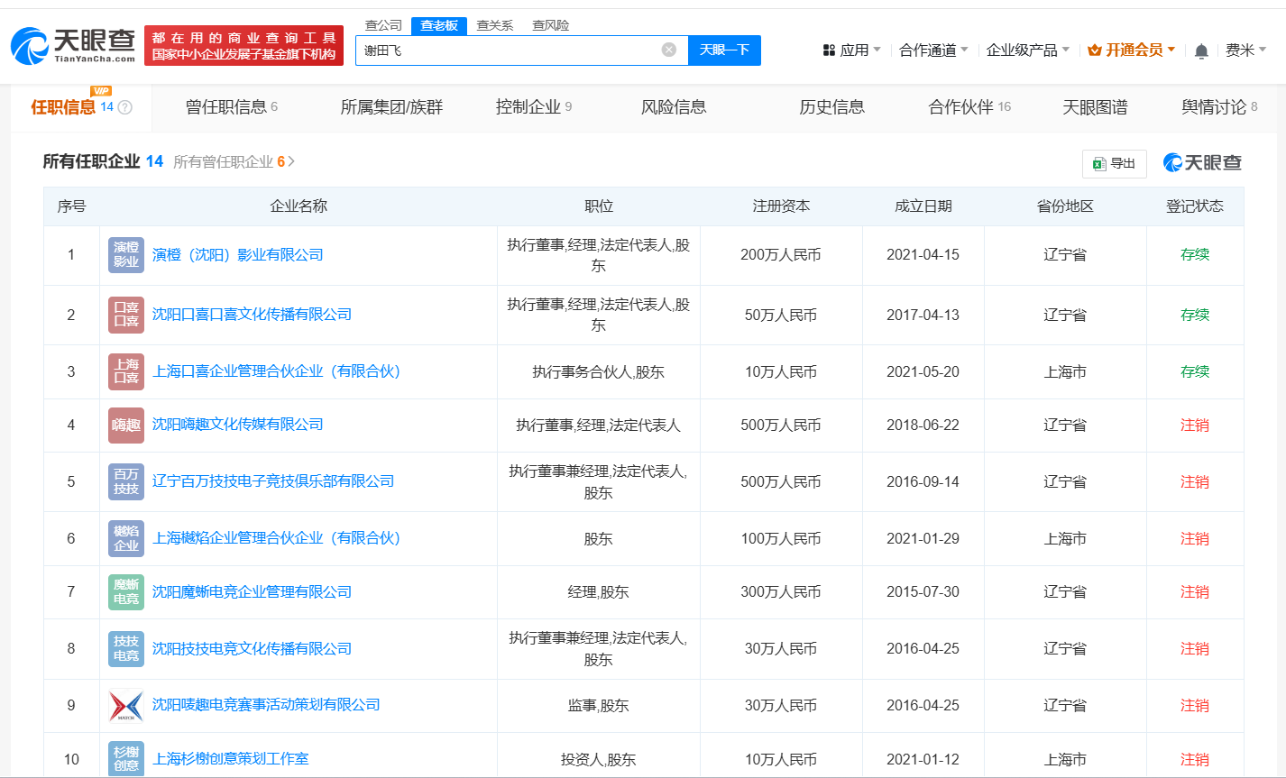 天眼查查关系信息显示,李雪阳与谢田飞曾共同关联的2家公司均已注销,分别是沈阳嗨趣文化传媒有限公司、上海樾焰企业管理合伙企业(有限合伙)。