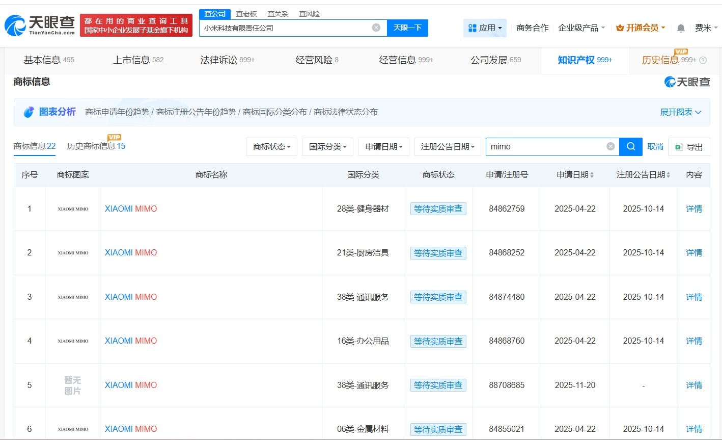 天眼查知识产权信息显示,近日,小米科技有限责任公司登记“Xiaomi MiMo标识设计”作品著作权,作品类别为美术。此前,该公司已申请注册多枚“XIAOMI MIMO”商标。
