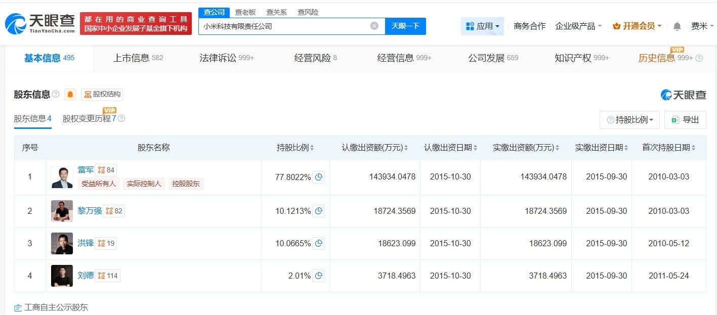 小米科技有限责任公司成立于2010年3月,法定代表人为雷军,注册资本18.5亿人民币,经营范围包括通讯设备销售、厨具卫具及日用杂品批发、厨具卫具及日用杂品零售等。股东信息显示,该公司由雷军、黎万强、洪锋、刘德共同持股。