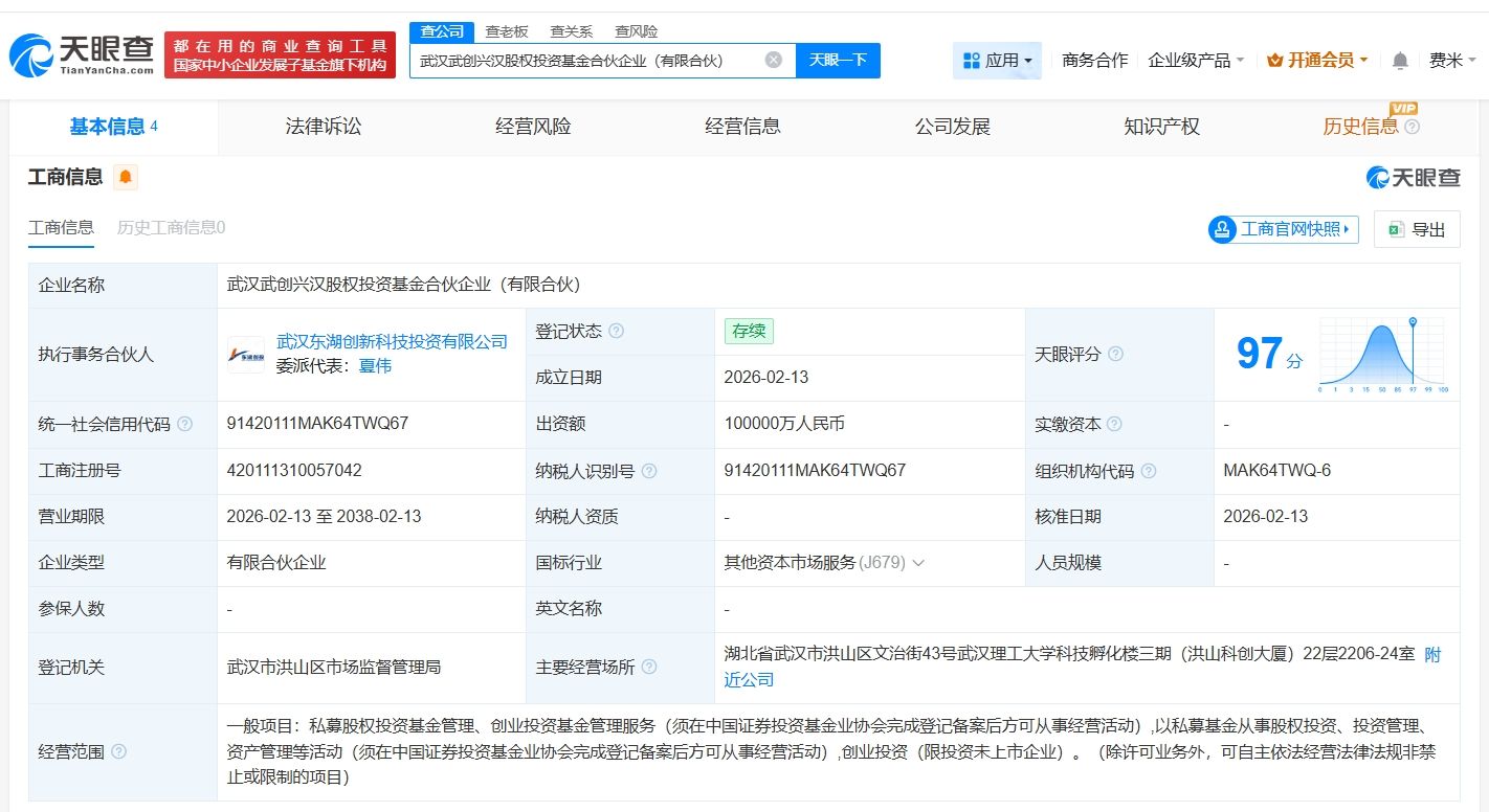天眼查App显示,近日,武汉武创兴汉股权投资基金合伙企业(有限合伙)成立,执行事务合伙人为武汉东湖创新科技投资有限公司,出资额10亿人民币,经营范围包括私募股权投资基金管理、创业投资基金管理服务、创业投资等,由武汉产业发展基金有限公司、武汉创新投资集团有限公司、武汉东湖创新科技投资有限公司共同出资。