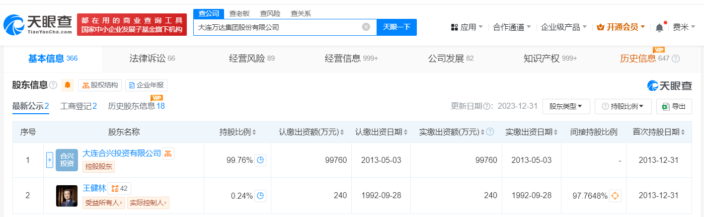 大连万达集团股份有限公司成立于1992年9月,法定代表人为王健林,注册资本10亿人民币,经营范围包括商业地产投资及经营、酒店建设投资及经营、连锁百货投资及经营等,由大连合兴投资有限公司、王健林共同持股。风险信息显示,该公司现存多条被执行人及股权冻结信息。