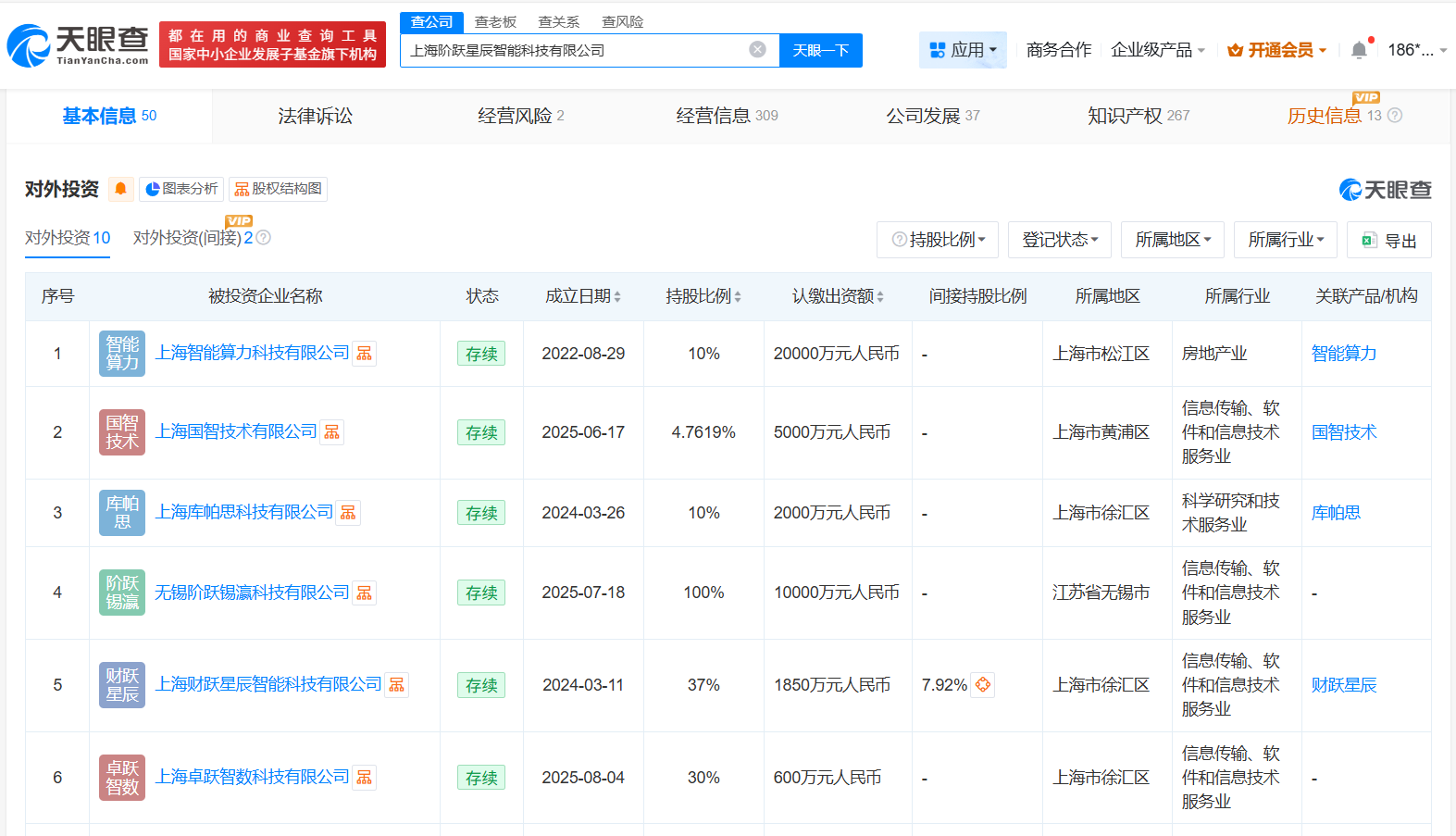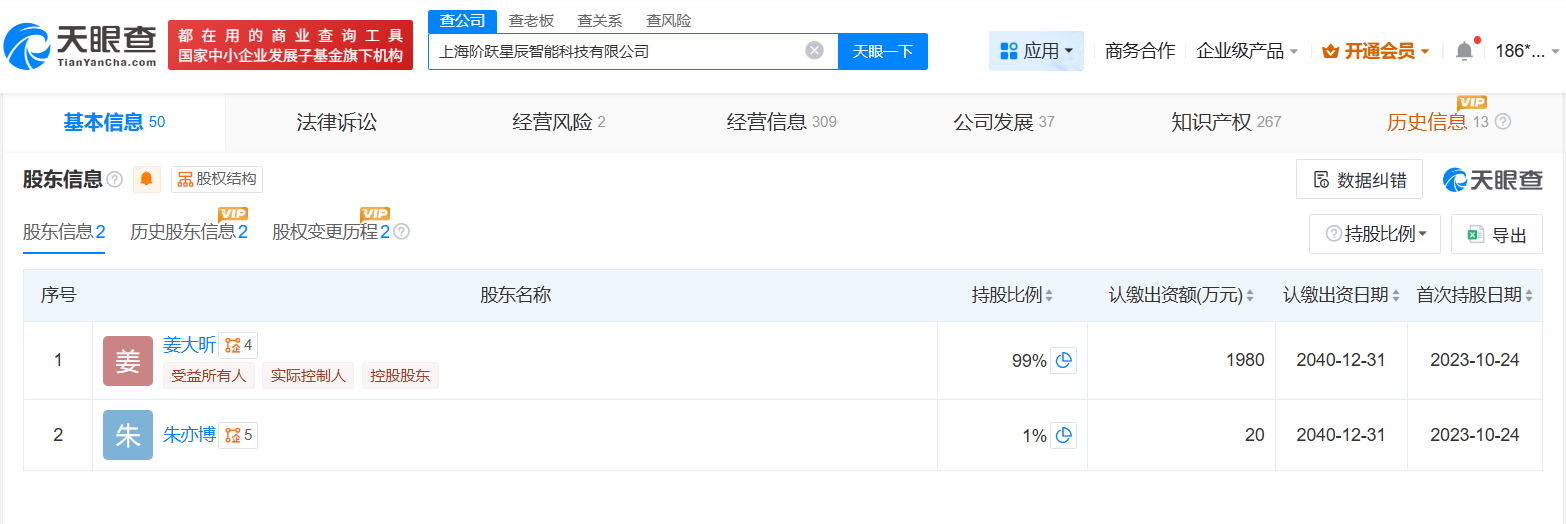 天眼查App显示,阶跃星辰关联公司上海阶跃星辰智能科技有限公司成立于2023年4月,法定代表人为姜大昕,注册资本2000万人民币,经营范围包括人工智能行业应用系统集成服务、人工智能应用软件开发、信息系统集成服务等,由姜大昕、朱亦博共同持股。对外投资信息显示,该公司对外投资10家企业,均为存续状态。值得一提的是,2025年以来,该公司已成立无锡阶跃锡瀛科技有限公司、上海国智技术有限公司等多家新公司。