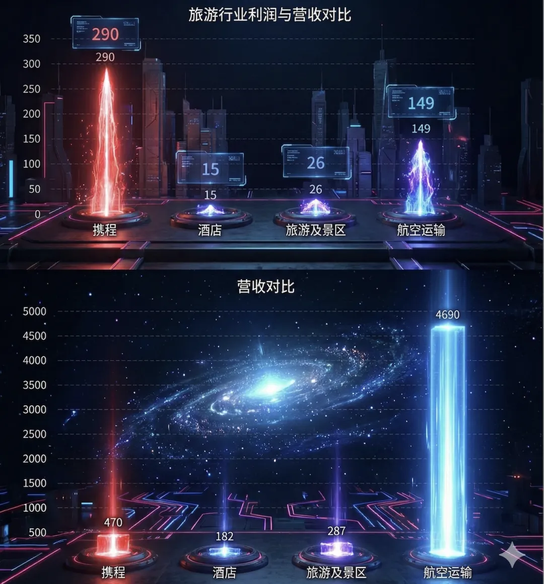 更耐人寻味的是,达成这个战绩,携程只用了全行业不到10%的营收(470亿 VS 5159亿),却拿走了全行业近90%的利润。