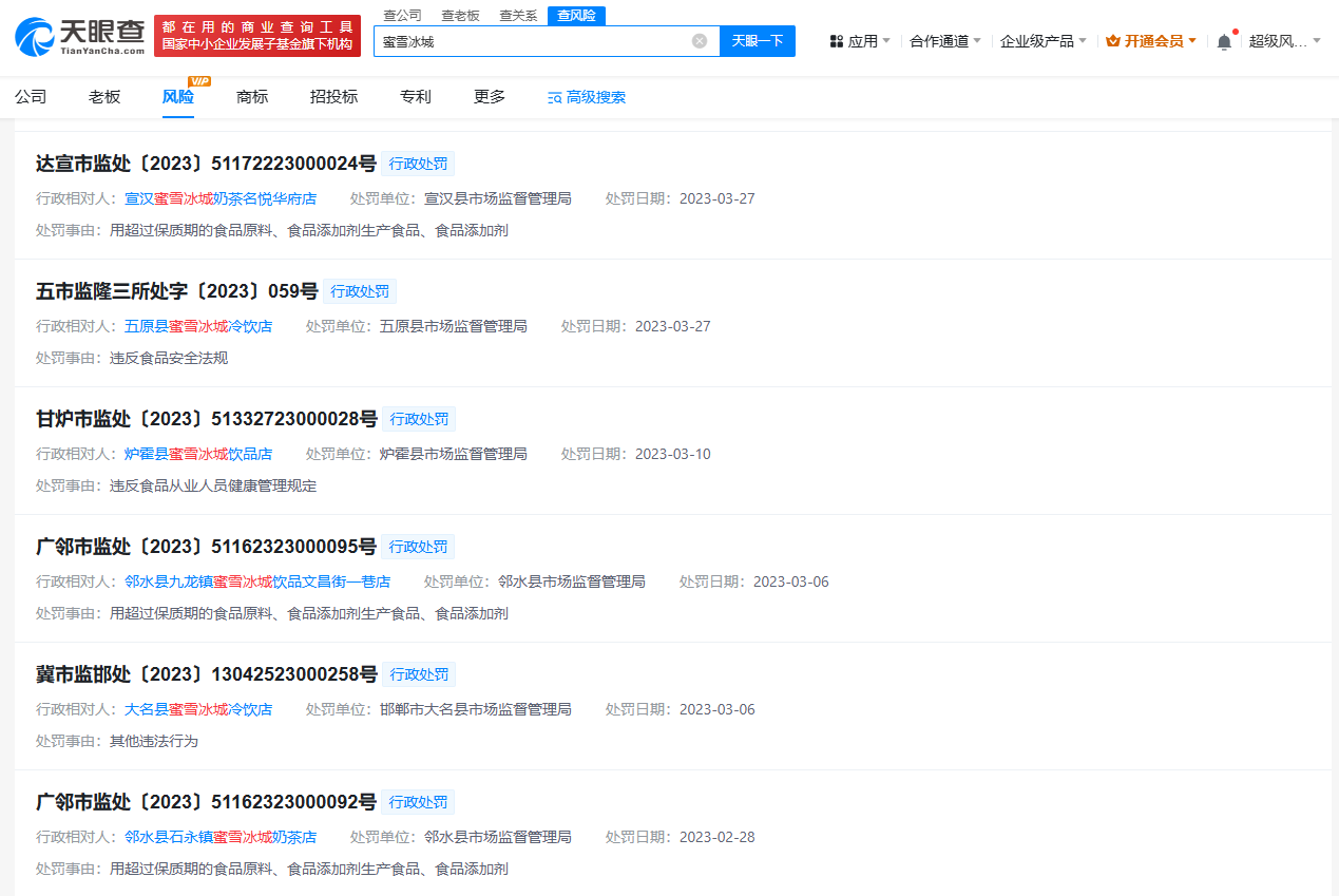 天眼查天眼风险信息显示,南涧县蜜雪冰城饮品店2020年11月制售经营的橙汁被抽检出大肠菌群超标,被南涧彝族自治县市场监督管理局罚款2万元。值得注意的是,此前已有邻水县九龙镇蜜雪冰城饮品文昌街一巷店、宣汉蜜雪冰城奶茶名悦华府店等多家蜜雪冰城门店因食品安全问题被罚。