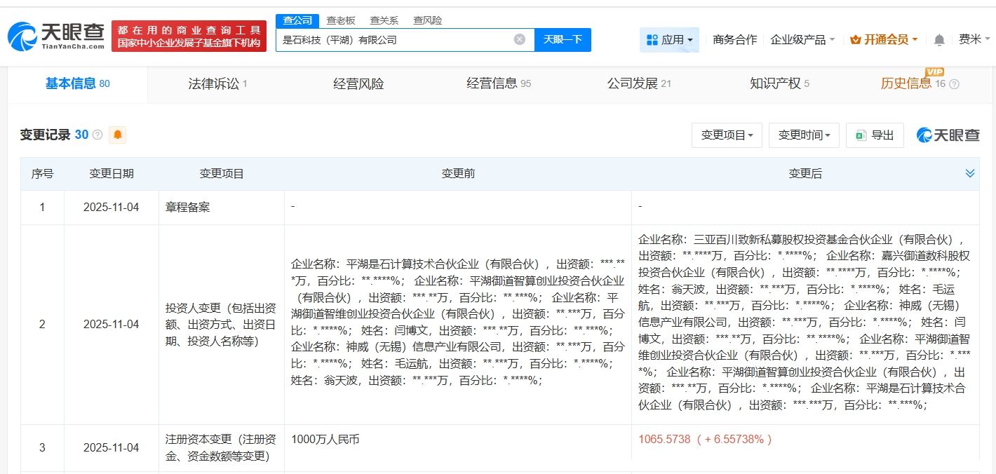 近日,是石科技(平湖)有限公司发生工商变更,新增百度旗下三亚百川致新私募股权投资基金合伙企业(有限合伙)、嘉兴御道数科股权投资合伙企业(有限合伙)为股东,同时,注册资本由1000万人民币增至约1065.6万人民币。