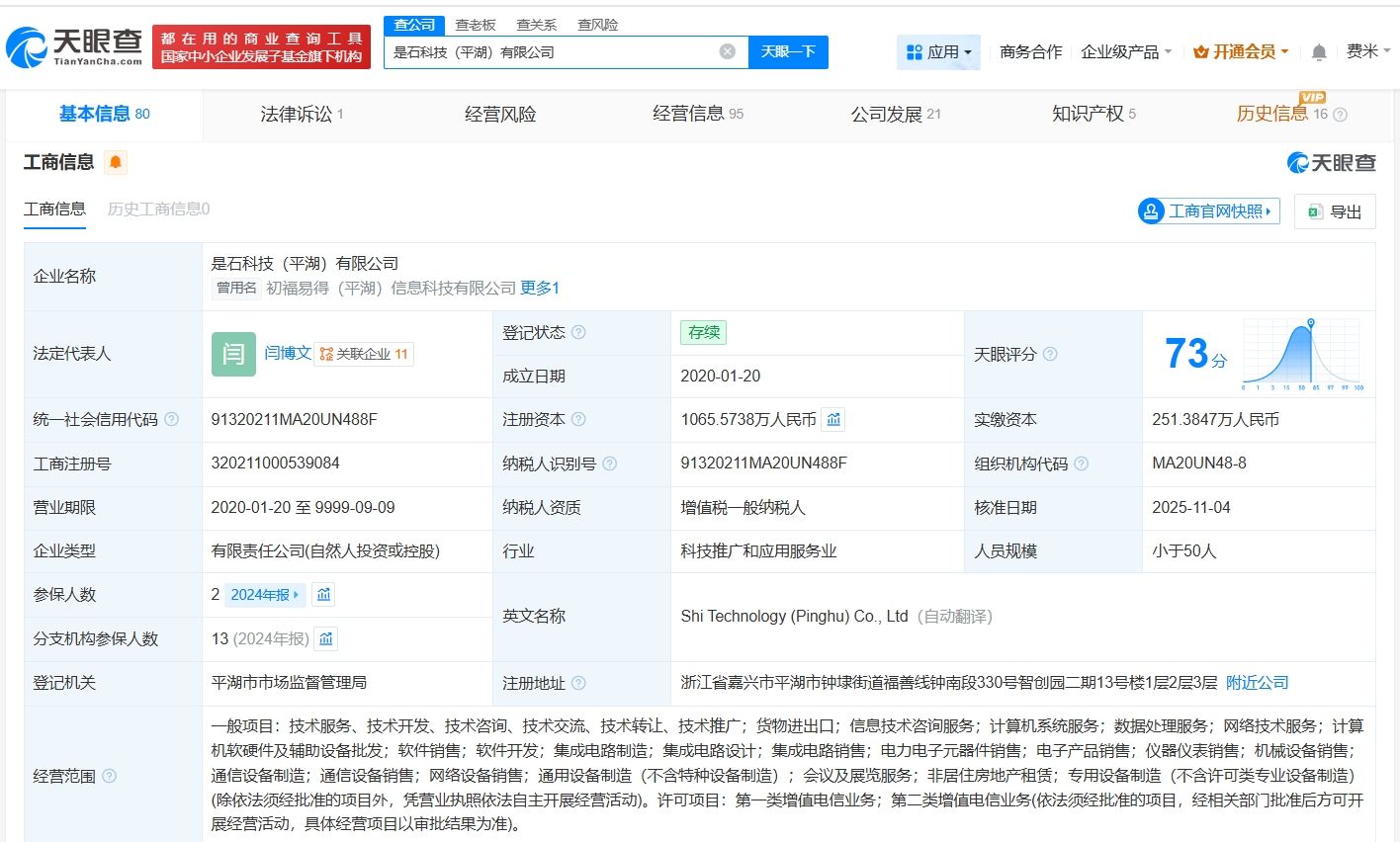 是石科技(平湖)有限公司成立于2020年1月,法定代表人为闫博文,经营范围包括信息技术咨询服务、计算机系统服务、数据处理服务等。股东信息显示,该公司现由闫博文、平湖是石计算技术合伙企业(有限合伙)及上述新增股东等共同持股。公开资料显示,该公司是一家算力服务类企业,业务覆盖AI基础模型研发、航空航天制造、生物医药新材料以及气候气象、新能源等领域。