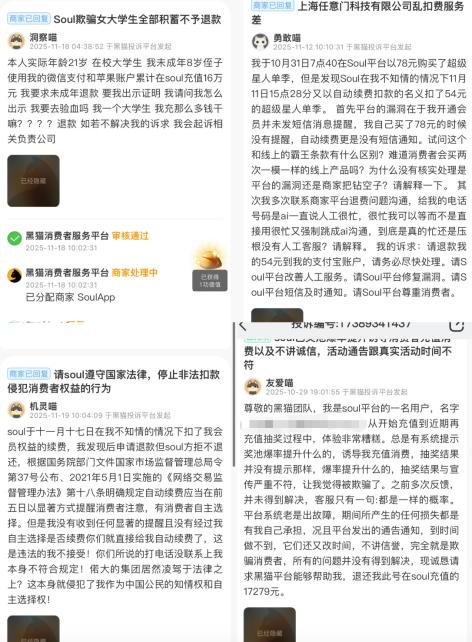 另有投诉指出,2022年有孩子在上网课期间偷偷使用手机在Soul充值4万多元,问题未得到解决;2025年9月也有未成年人花费216元购买Soul币进行抽奖,家长认为平台“对未成年人监管不到位”。