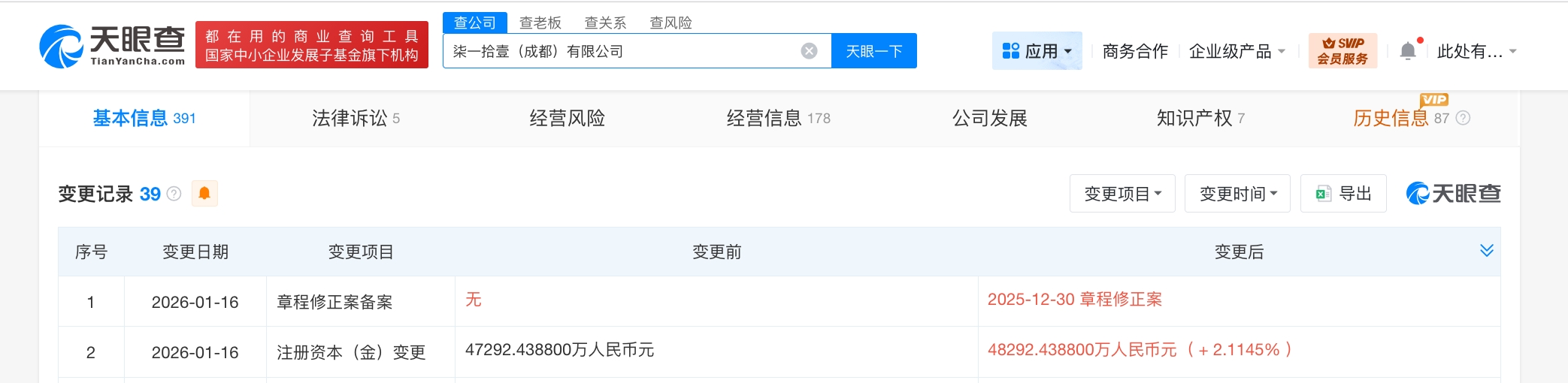 天眼查工商信息显示,近日,柒一拾壹(成都)有限公司发生工商变更,注册资本由约4.7亿人民币增至约4.8亿人民币。