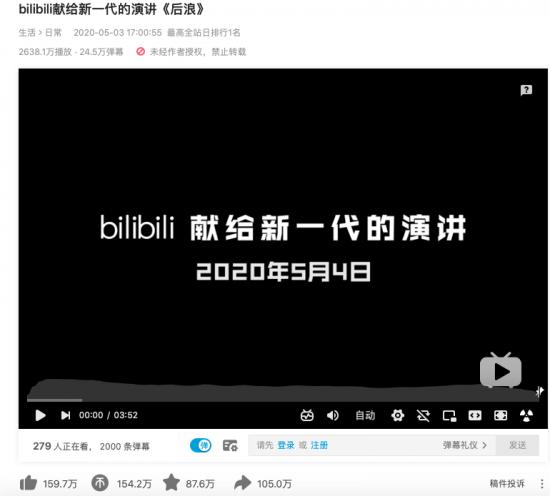 对比之下,《后浪》目前在B站的播放量为2638.1万,产生了24.5万弹幕,获得了105万次转发,159.7万次点赞。在微博#后浪#话题阅读量为2.4亿,讨论6.5万。