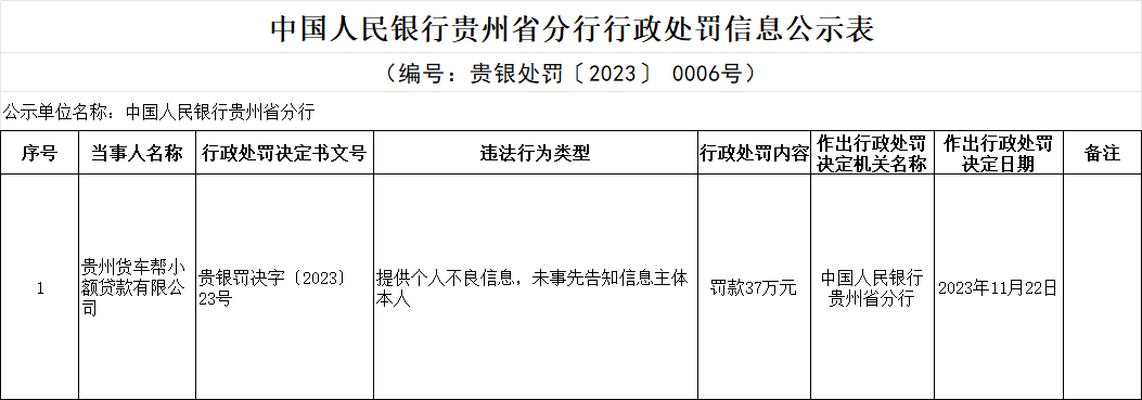 2023年,满帮集团旗下贵州货车帮小额贷款有限公司因“未事先告知信息主体本人便提供不良信息”被央行贵州分行罚款37万元。