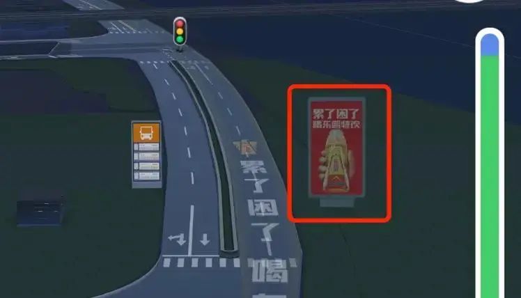 与传统导航软件的开屏广告或搜索结果广告不同,百度地图此次推出的"车道级广告"直接将商业信息植入到了核心导航界面。从用户提供的截图可以看到,这些广告并非简单的悬浮窗口或边缘展示,而是与导航路线融为一体——广告文字被设计成仿佛"喷涂"在虚拟道路表面,有些版本甚至还在路边设置了虚拟广告牌,使得整个导航界面看起来像是被商业广告"占领"了一般。