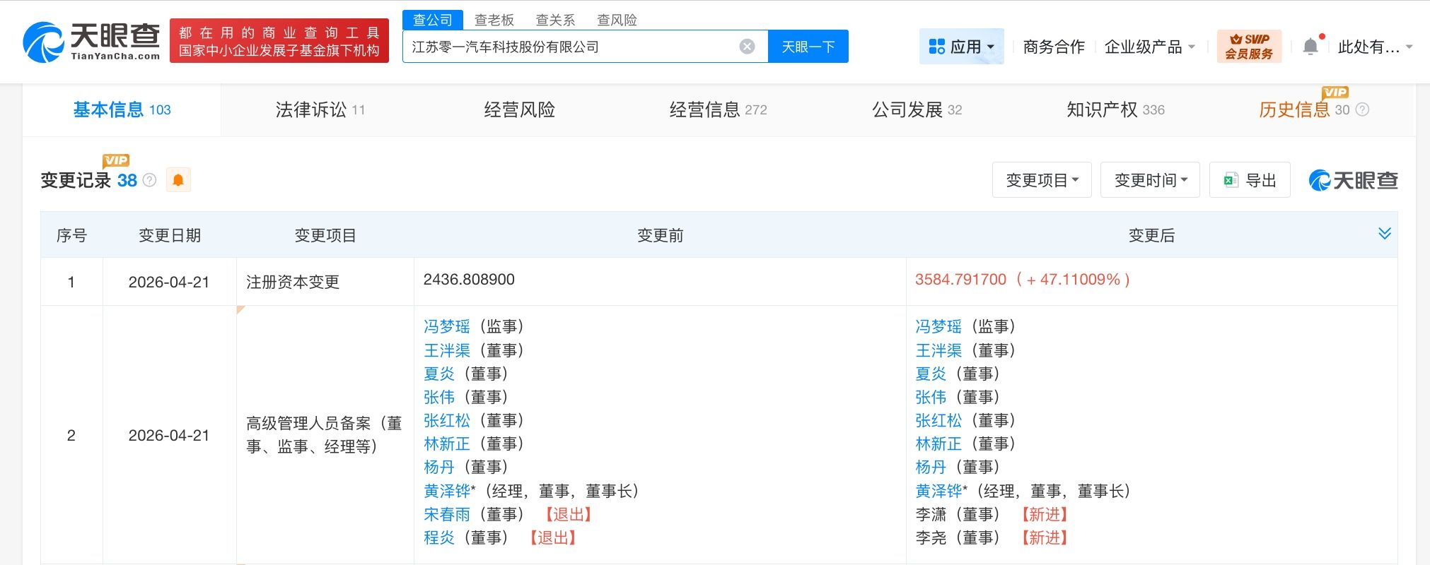 天眼查App显示,近日,零一汽车关联公司江苏零一汽车科技股份有限公司发生工商变更,注册资本由约2437万人民币增至约3585万人民币,增幅约47%,同时,部分高管也发生变更。