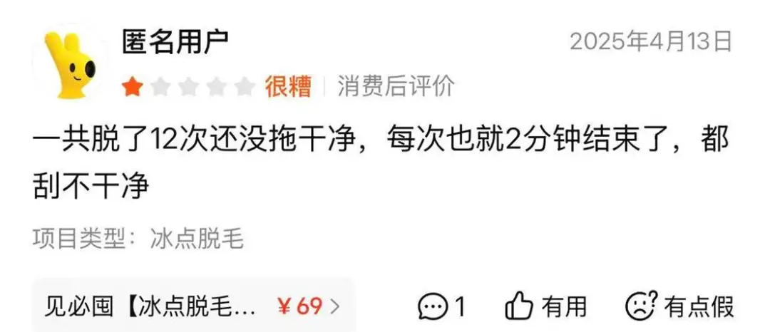 还有消费者怒斥大连艾加艾医美的冰点脱毛套路,一共脱满12次仍残留大片毛茬,每次操作仅2分钟就草草结束,连刮刀都没刮干净,纯属花钱走过场。
