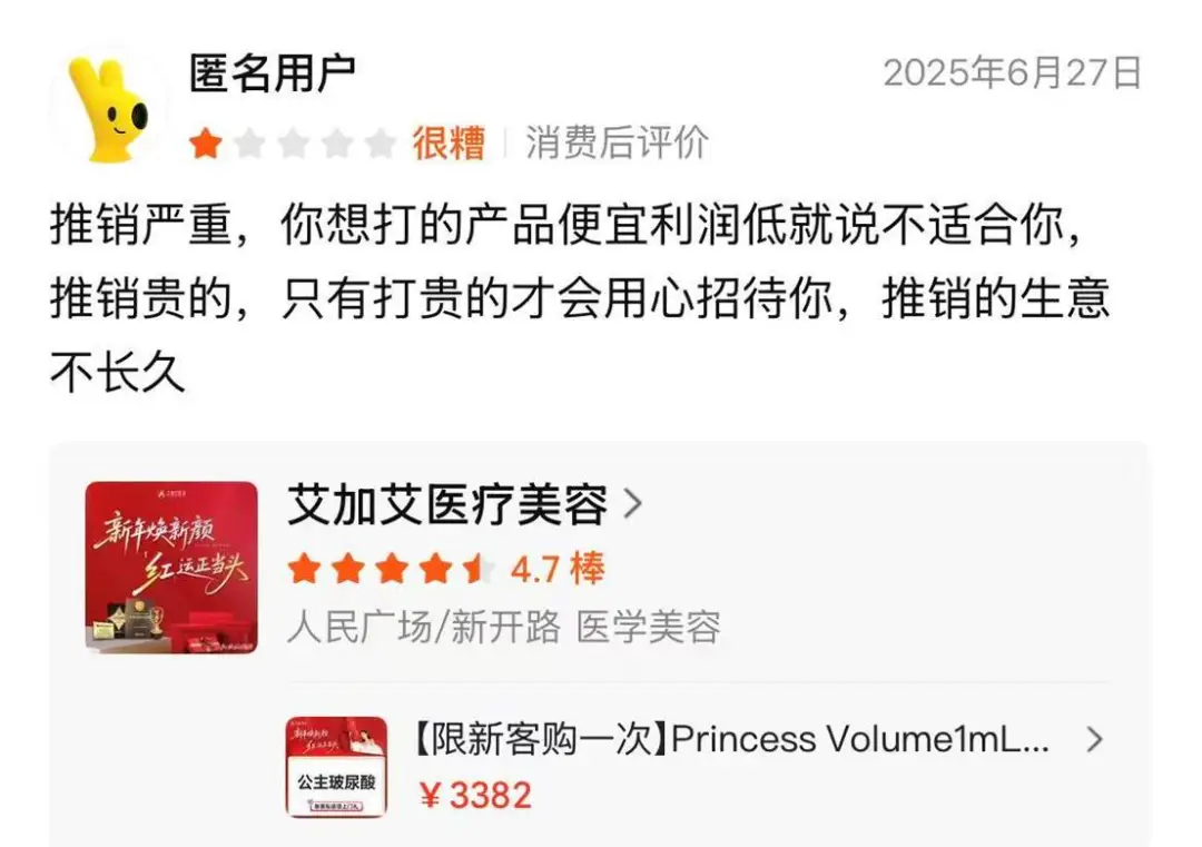 有的消费者原本只想打平价项目,就被工作人员一句利润低、不适合打发,只有掏钱买高额产品,才配享受笑脸服务。消费者直呼,这种推销式医美注定是一锤子买卖,根本长久不了。