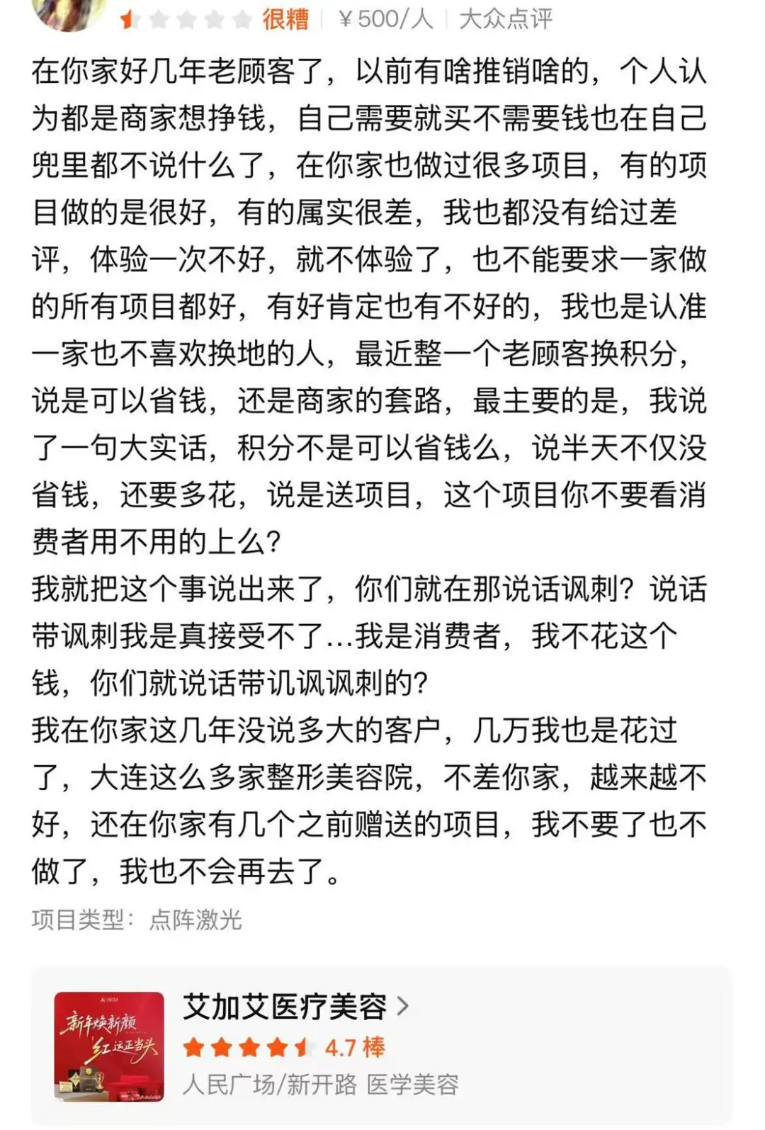 这位美团用户表示,自己作为大连艾加艾医美好几年的老顾客,花过几万也做过不少项目,好的坏的都自己咽,从没给过差评。这回老顾客换积分说能省钱,自己随口一句怎么算完还要多花,就被工作人员当众阴阳怪气、冷嘲热讽,实在寒心。积分送的项压根用不上,自己不过说句实话,就被讽刺舍不得花钱。