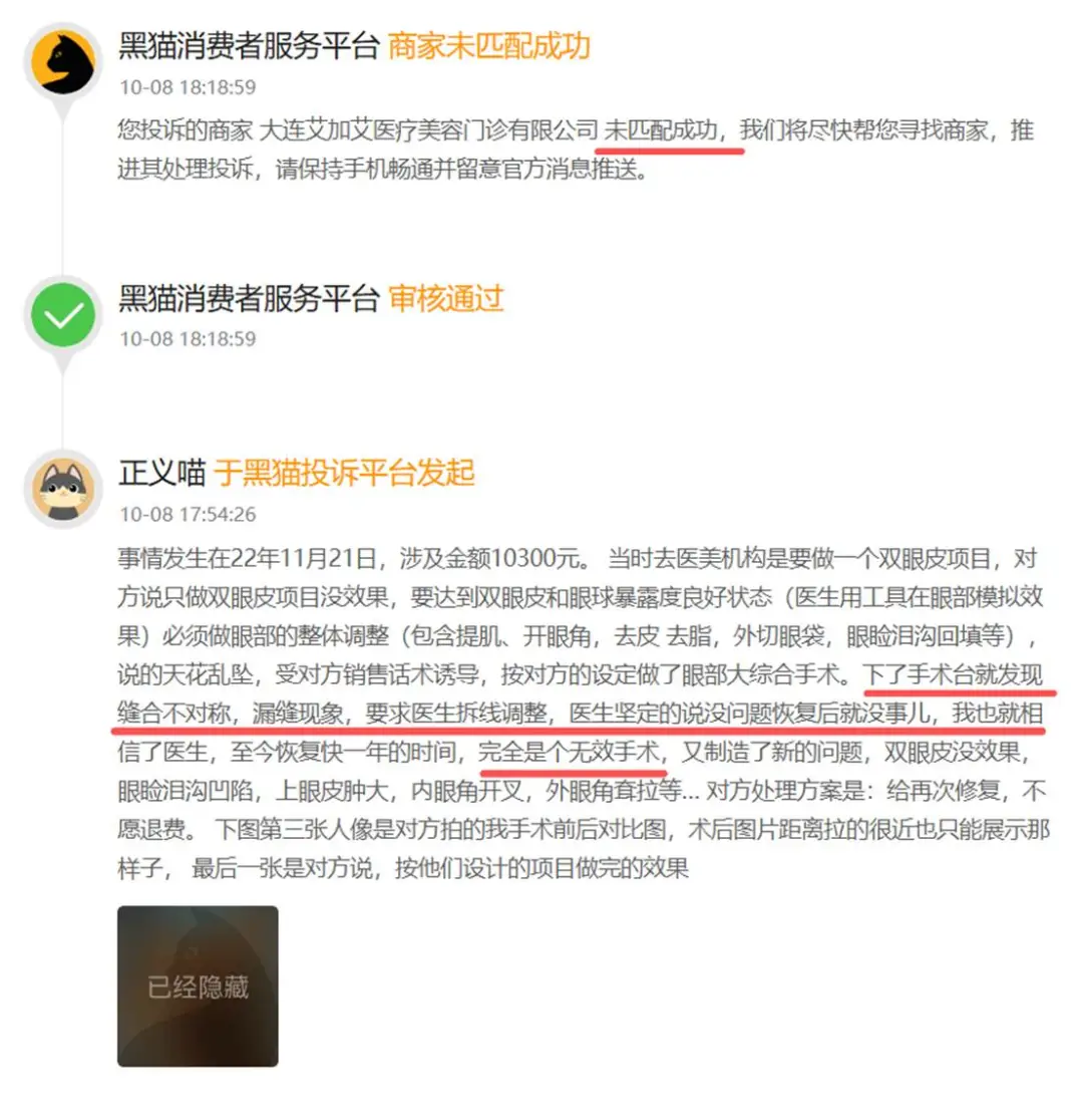 早在2022年11月21日,就有消费者在黑猫投诉曝光大连艾加艾医美。