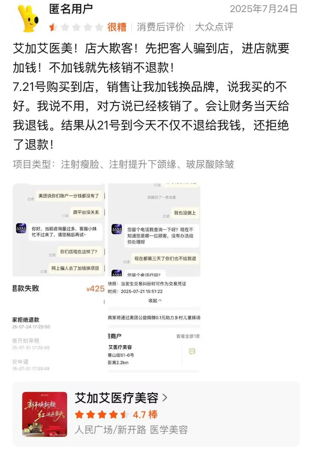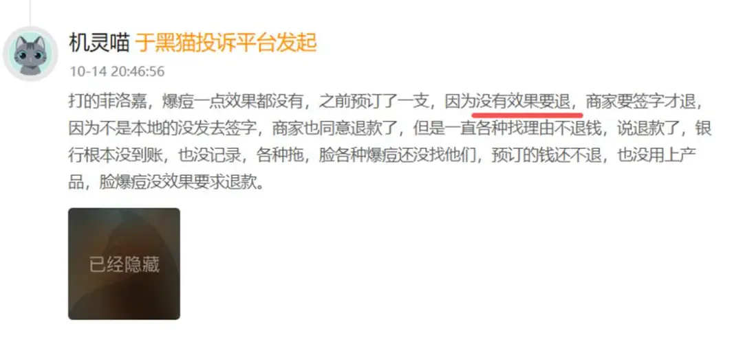 还有消费者在黑猫投诉平台怒斥大连艾加艾医美产品没用,预订款也不退。据消费者描述,她在大连艾加艾医美打了菲洛嘉后全脸爆痘,毫无效果,就想把剩下的一只退款。但院方却先以必须到店签字为由拖延退款,又因消费者自己异地无法到场,口头答应退款,后又各种理由拖延,声称已退却查不到任何银行到账记录。