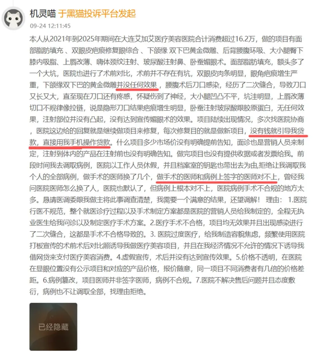 2025年9月24日,更有消费者爆料大连艾加艾医美存在诱导贷款的行为。