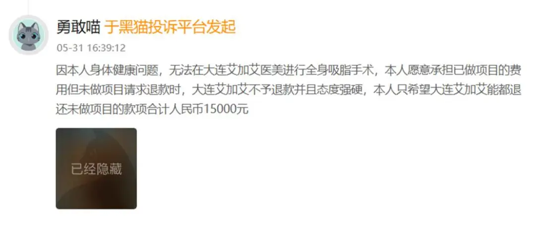 有的消费者因健康原因无法继续接受大连艾加艾医美预定的全身吸脂,愿结清已做项目费用,仅要求退还未做的15000元尾款,却遭院方强硬拒绝,分文不退。