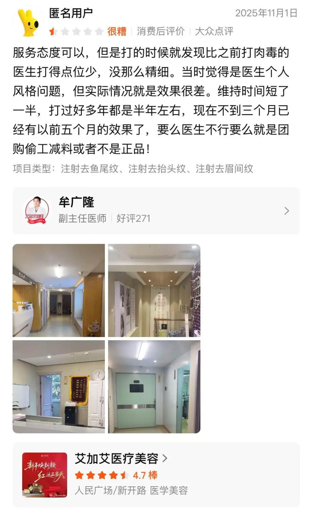 当时以为是医生风格,结果效果特别差,维持时间直接腰斩,以往半年才失效,这次不到三个月就回到五个月前的状态,怀疑要么医生技术拉胯,要么团购偷工减料甚至用了假货。