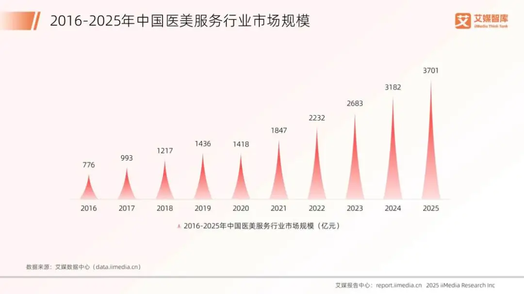 2026年1月5日,艾媒咨询发布《2025年中国医美行业发展状况与消费行为调查数据》指出,2025年中国医美服务行业市场规模已达3701亿元,其中非手术类(轻医美)项目贡献1295亿元,手术类项目达1466亿元。