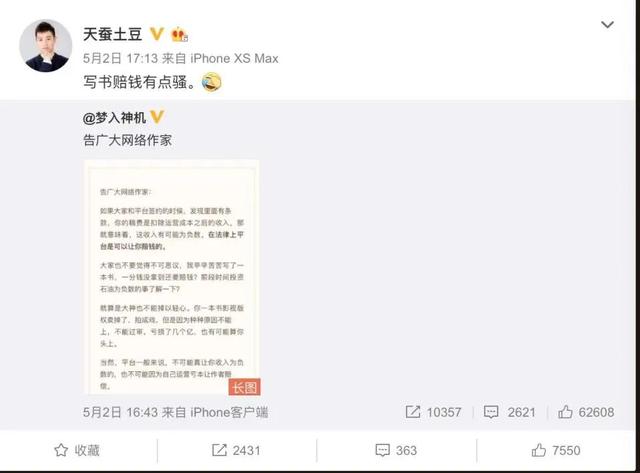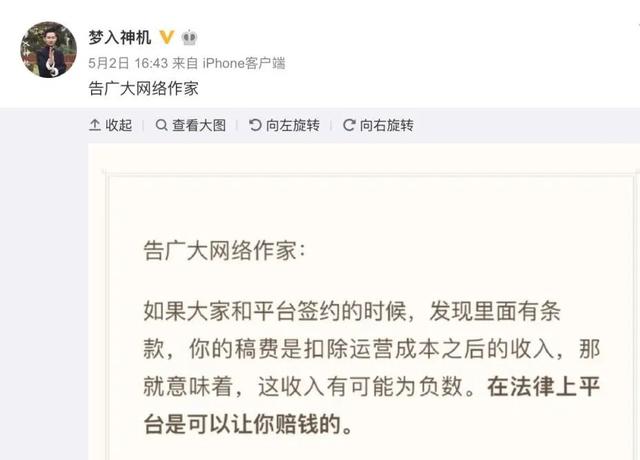 梦入神机发表长微博指出:"如果大家和平台签约的时候,发现里面有条款你的稿费是扣除运营成本之后的收入,那就意味着,这收入有可能为负数。在法律上平台是可以让你赔钱的。"天蚕土豆随后转发了梦入神机的微博并写上:写书赔钱有点骚。