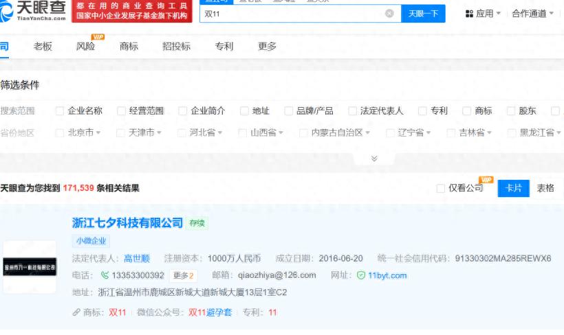 据天眼查APP显示,双11品牌隶属浙江七夕科技有限公司,公司成立于2016年,位于浙江省温州市,是一家以从事零售业为主的企业,浙江七夕科技有限公司商标信息52条,专利信息22条。