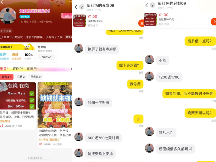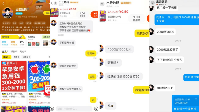 随机联系一位昵称为“出云数码”的闲鱼用户,对方公开表示:“苹果16全款可以借1000元,七天后还款1300元;借1300元需还1750元;若借2000元,七天还款为3000元”。即便对方主动提出可补贴100-200元红包以示“利息高”,其实际年化利率依然远超国家允许的36%红线,构成典型高利贷。