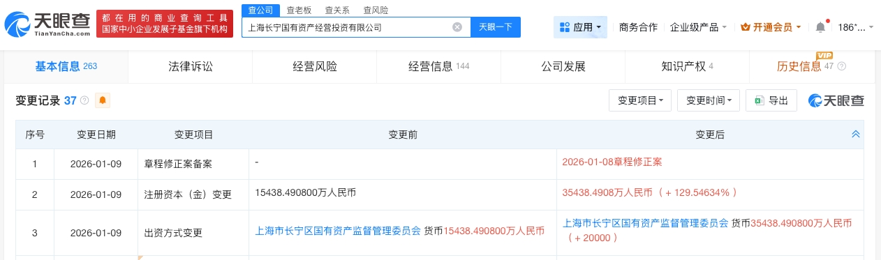 天眼查工商信息显示,近日,上海长宁国有资产经营投资有限公司发生工商变更,注册资本由约1.54亿人民币增至约3.54亿人民币,增幅约130%。