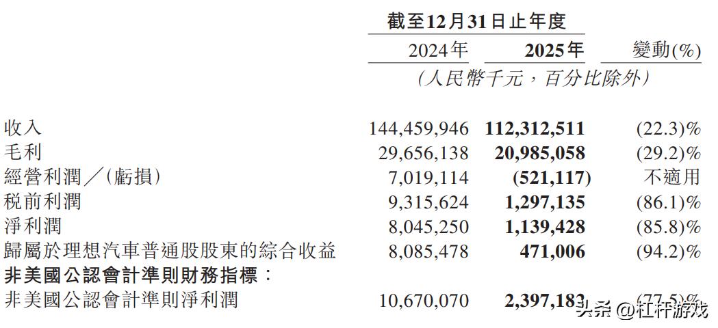 2026年3月12日,理想汽车披露2025年财务报告。数据有点扎眼,因为营收、利润双双下跌。尤其归母净利润同比跌幅达到86%,而且已经出现经营亏损。