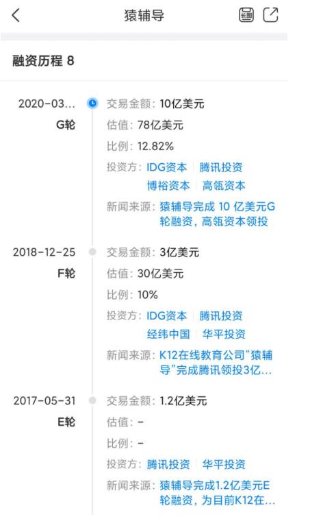 8月31日,据36氪报道,猿辅导即将完成新一轮12亿美元融资,投后估值130亿美元,老股东腾讯、高领和博裕资本都有参投。若交易完成,猿辅导将成为全球估值最高的在线教育独角兽公司。