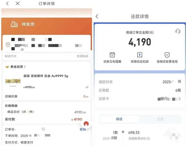 众花优选商城的运营模式与上述报道案例高度相似。有消费者小蒋(化名)提供的下单页面显示,2025年10月,其在众花优选下单的3克规格的国富足金摆件售价为4190元,当时水贝黄金的金条价格在1000元左右,由此计算该产品溢价约为40%。而小蒋在被回收商以约6折的价格“收割”后,仍需在6个月内按照4190元的价格还款,单利年化利率推算已超过100%,明显已超出了24%红线。