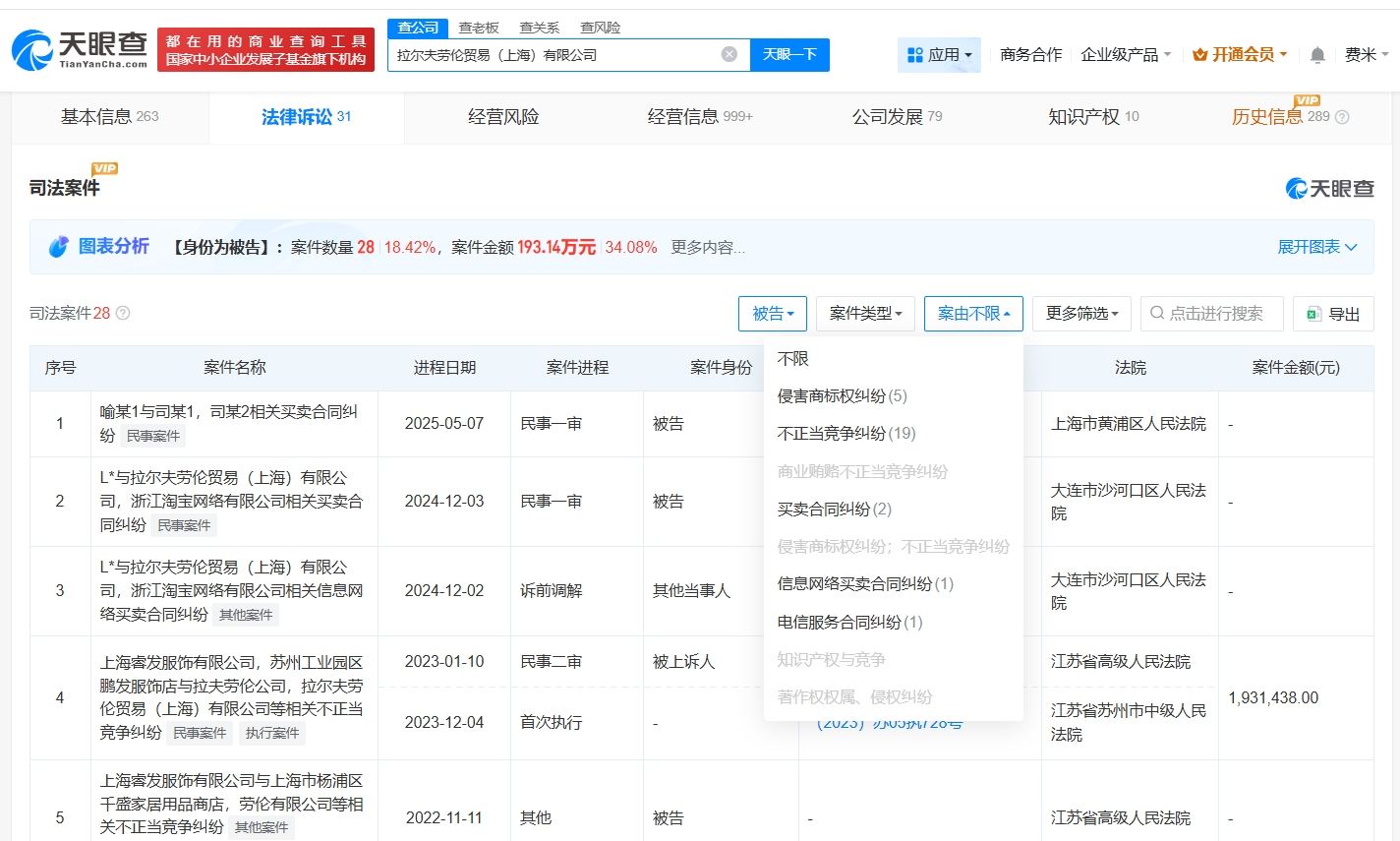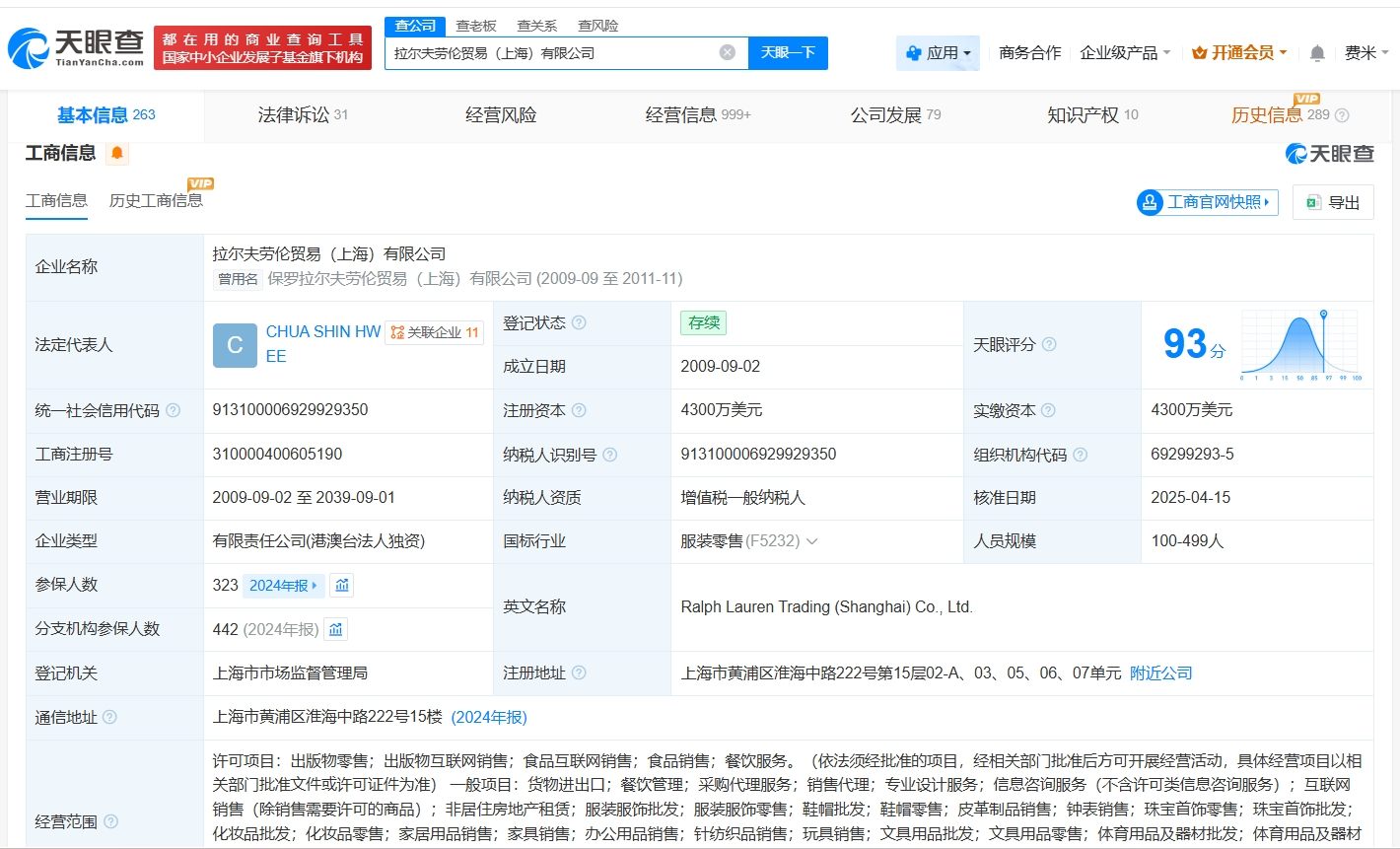 拉夫劳伦中国关联公司拉尔夫劳伦贸易(上海)有限公司成立于2009年9月,法定代表人为CHUA SHIN HWEE,注册资本4300万美元,经营范围包括出版物零售、出版物互联网销售、食品互联网销售等,由Ralph Lauren Asia Holding Company Limited全资持股。风险信息显示,该公司曾涉及多起法律诉讼信息,案由涉及不正当竞争纠纷、买卖合同纠纷等。