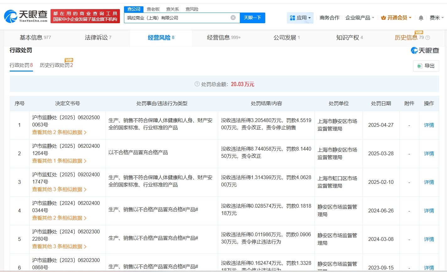 天眼查App显示,ZARA中国关联公司飒拉商业(上海)有限公司成立于2005年10月,法定代表人为JOSE ANDRES SANCHEZ IGLESIAS,注册资本4512万美元,经营范围包括服装服饰零售、服装服饰批发、针纺织品销售等。股东信息显示,该公司由INDUSTRIA DE DISENO TEXTIL,S.A.全资持股。经营风险信息显示,该公司曾多次因以不合格产品冒充合格产品被罚。