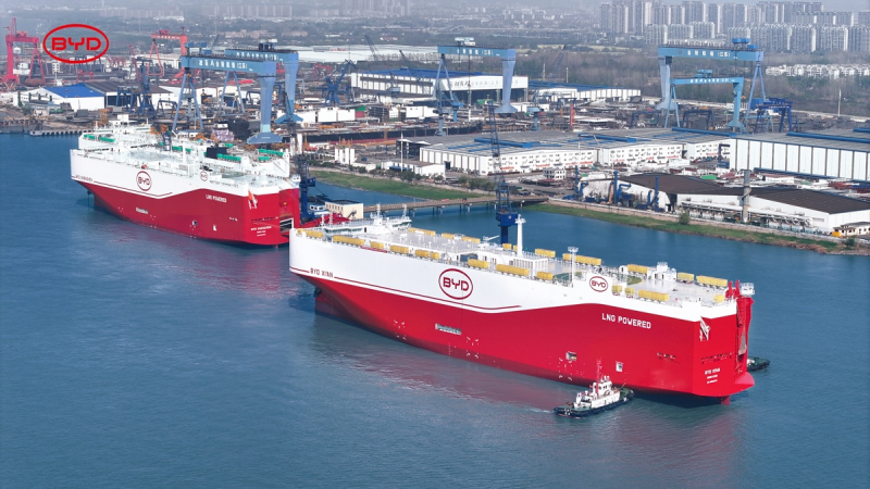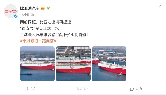 2022年,比亚迪宣布将耗资50亿元订购8艘可装载7000辆汽车以上的专用滚装船,目前已经有6艘船下水。