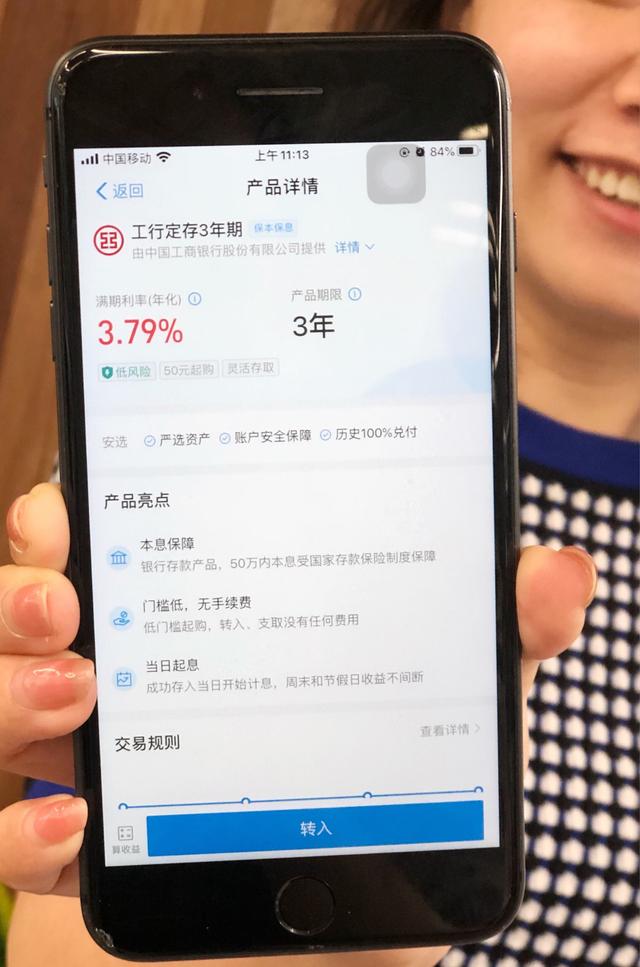 记者从支付宝里看到,这款新上的三年期存款年化利率在3.79%,方便的是,即使用户之前没有工行卡也能在线开户后完成购买。产品页面采用了加大号字体,尤其适合老年朋友阅读,存款产品的期限、利率一目了然。