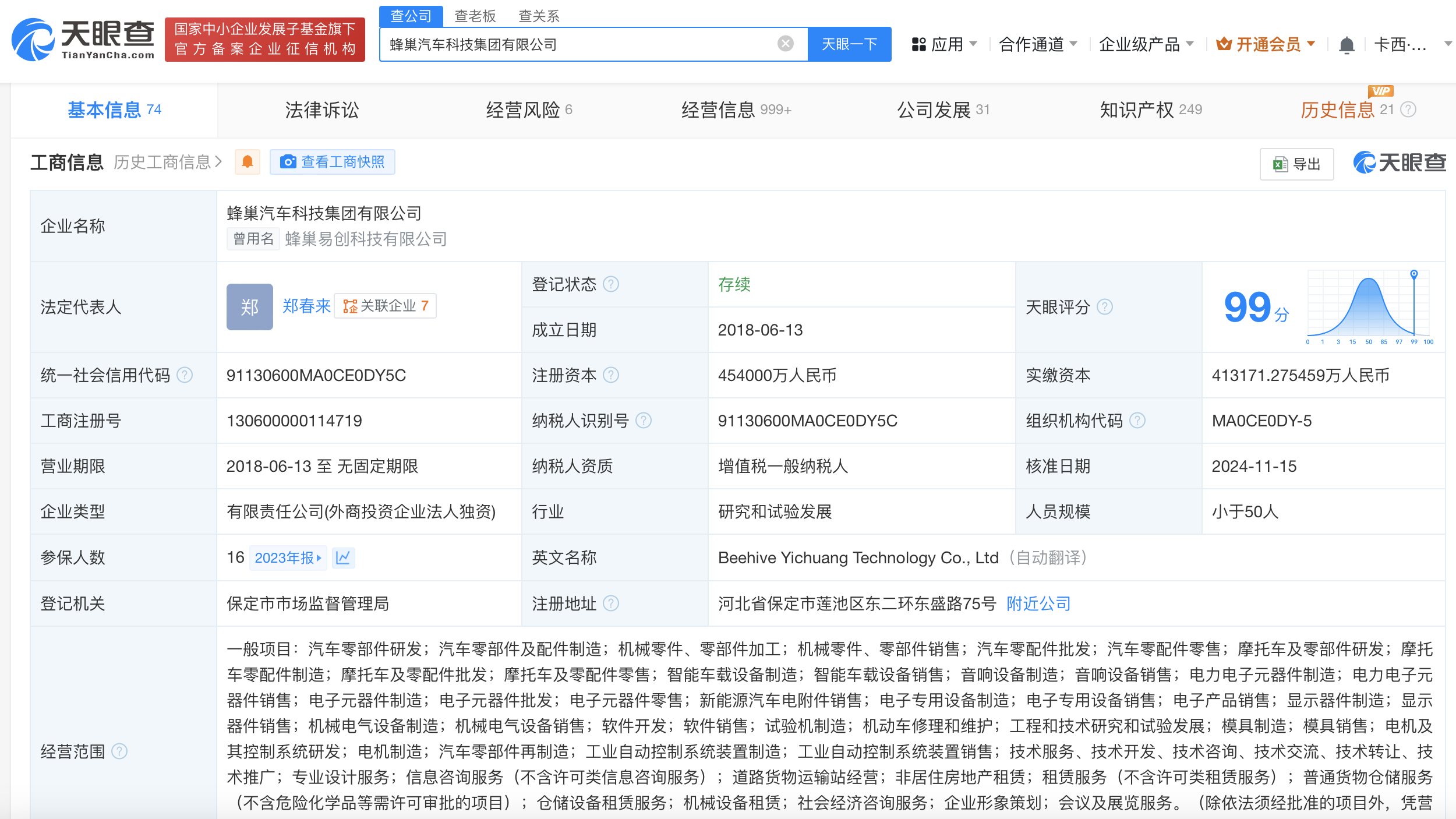 天眼查App显示,近日,蜂巢易创科技有限公司发生工商变更,企业名称变更为蜂巢汽车科技集团有限公司,经营范围新增汽车零配件批发、摩托车零配件制造、智能车载设备销售等,同时部分主要人员发生变更。