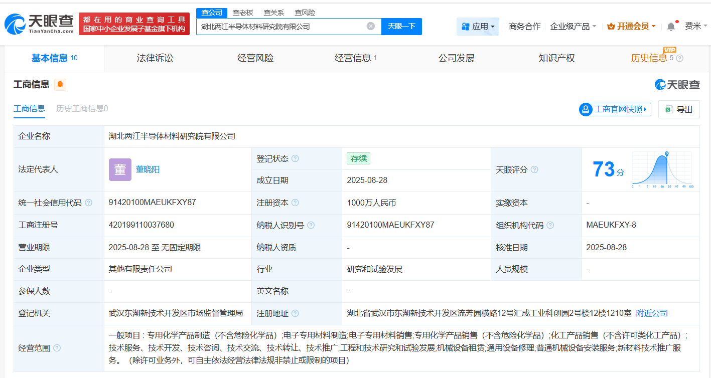 天眼查工商信息显示,近日,湖北两江半导体材料研究院有限公司成立,法定代表人为董晓阳,注册资本1000万人民币,经营范围包括电子专用材料制造、电子专用材料销售、专用化学产品销售等。