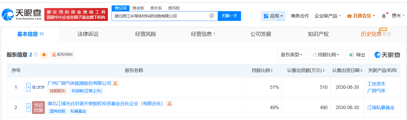 天眼查工商信息显示,近日,湖北两江半导体材料研究院有限公司成立,法定代表人为董晓阳,注册资本1000万人民币,经营范围包括电子专用材料制造、电子专用材料销售、专用化学产品销售等。股东信息显示,该公司由广钢气体(688548)、湖北江城光谷封装天使股权投资基金合伙企业(有限合伙)共同持股。