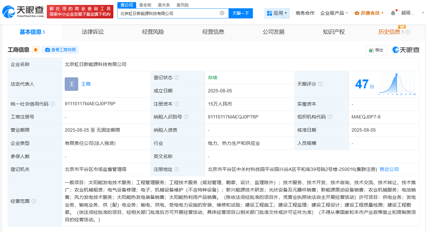 近日,北京虹日新能源科技有限公司成立,法定代表人为王璐,注册资本15万人民币,经营范围包括太阳能发电技术服务、工程管理服务、新能源原动设备销售、新兴能源技术研发等。